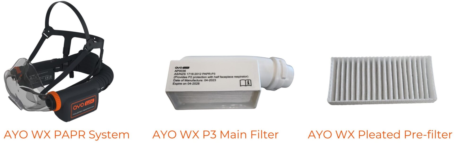 • In contrary, AYO WX HFM PAPR has a unique low-cost pleated pre-filter that can capture larger particles with reasonable dust-loading capacity and protect the HEPA filter. As a result, the HEPA filter can last longer while the pleated prefilter can be changed often at a very low cost.
