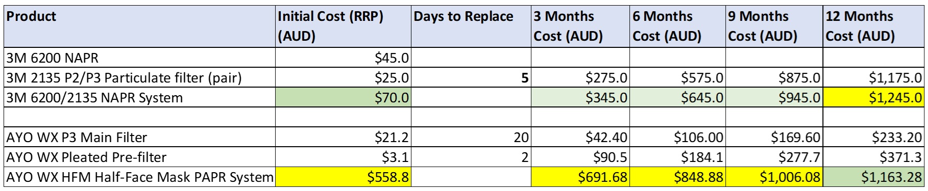 • The above comparison is based on the RRP for one AYO WX HFM Half-face Mask PAPR System. For large organizations with higher order quantity, the unit price will be lower than the RRP, thus the ‘breakeven’ time will be shorter accordingly.